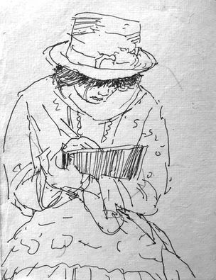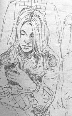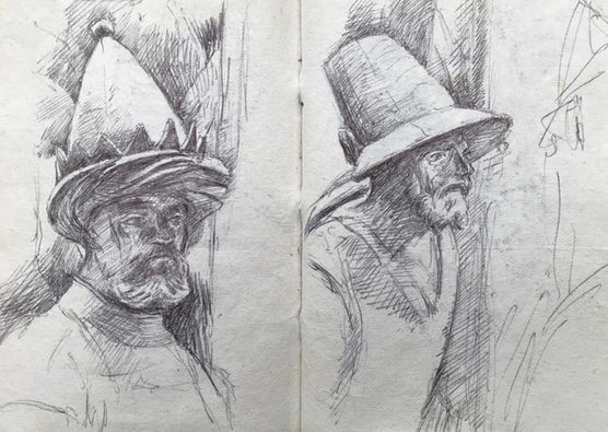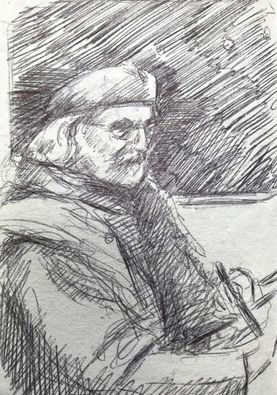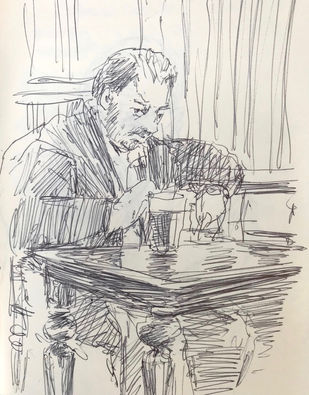 I draw while on the train, in pubs, in libraries, in museums, in concert halls, in the countryside, in cities, towns, and villages… I favour very portable A5 leather-bound books and always use a black pen (a ballpoint, rollerball, or sometimes a fine-point rapidograph). It is good to work with limitations on process and using an ink pen prevents having smudged graphite drawings in books that usually receive a good bit of wear and tear… It also banishes erasure… I generally work linearly, and often employ hatching and cross-hatching. I produce huge numbers of drawings, some the result of heightened awareness, others the result of just trying to focus! I probe, I analyse, I explore and experiment… it must always be “low stakes”, notational, and there should never be anything too precious about the process… the books also become repositories for written notes, ideas, and observations...